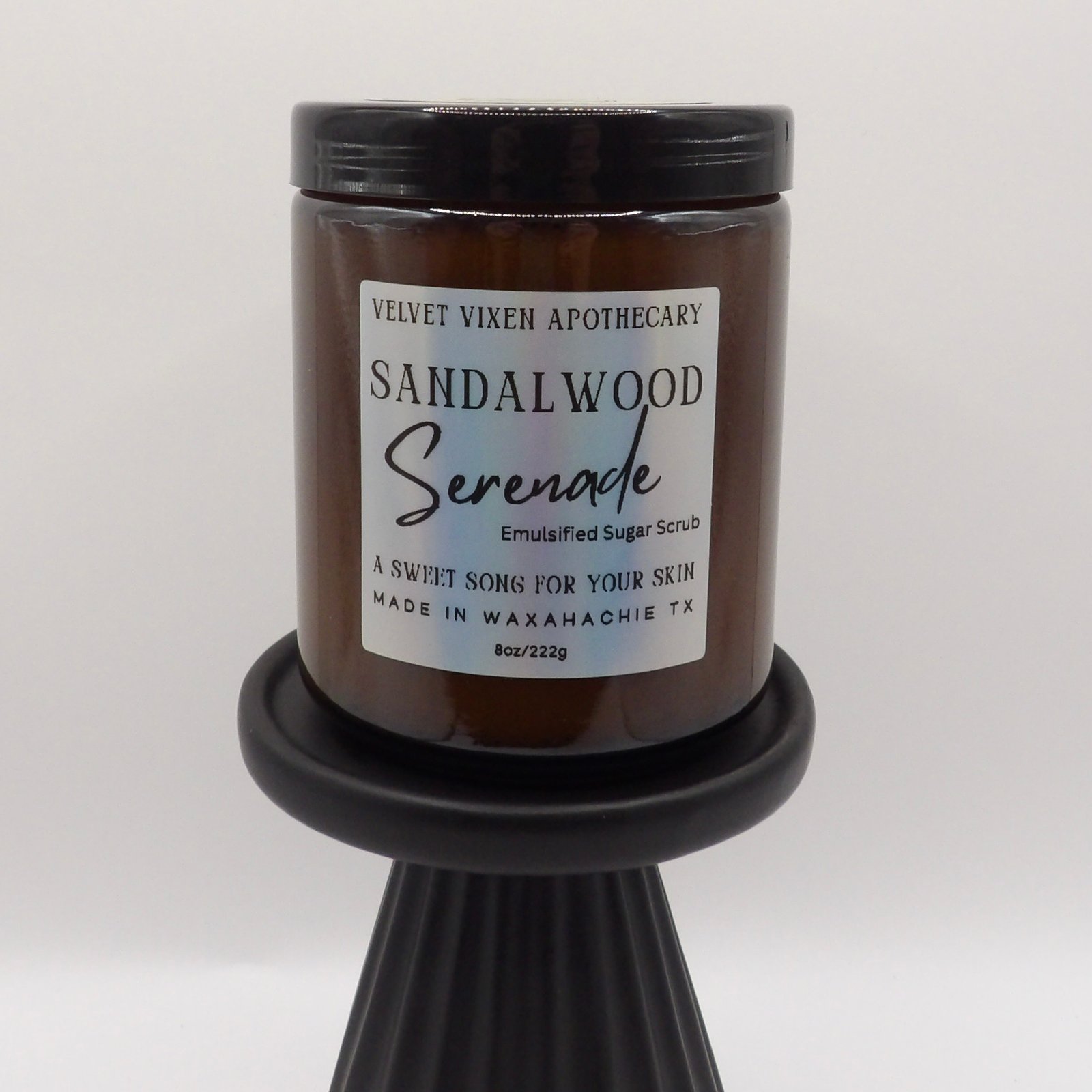 Sandalwood Serenade is a soulful blend of grounding woods and gentle florals. This emulsified sugar scrub exfoliates with finesse, transforming into a creamy lotion that leaves your skin smooth, moisturized, and scented like a moonlit forest. Vanilla sandalwood brings depth and warmth, while lavender adds a whisper of calm. Crafted for those who crave serenity with a touch of mystery.